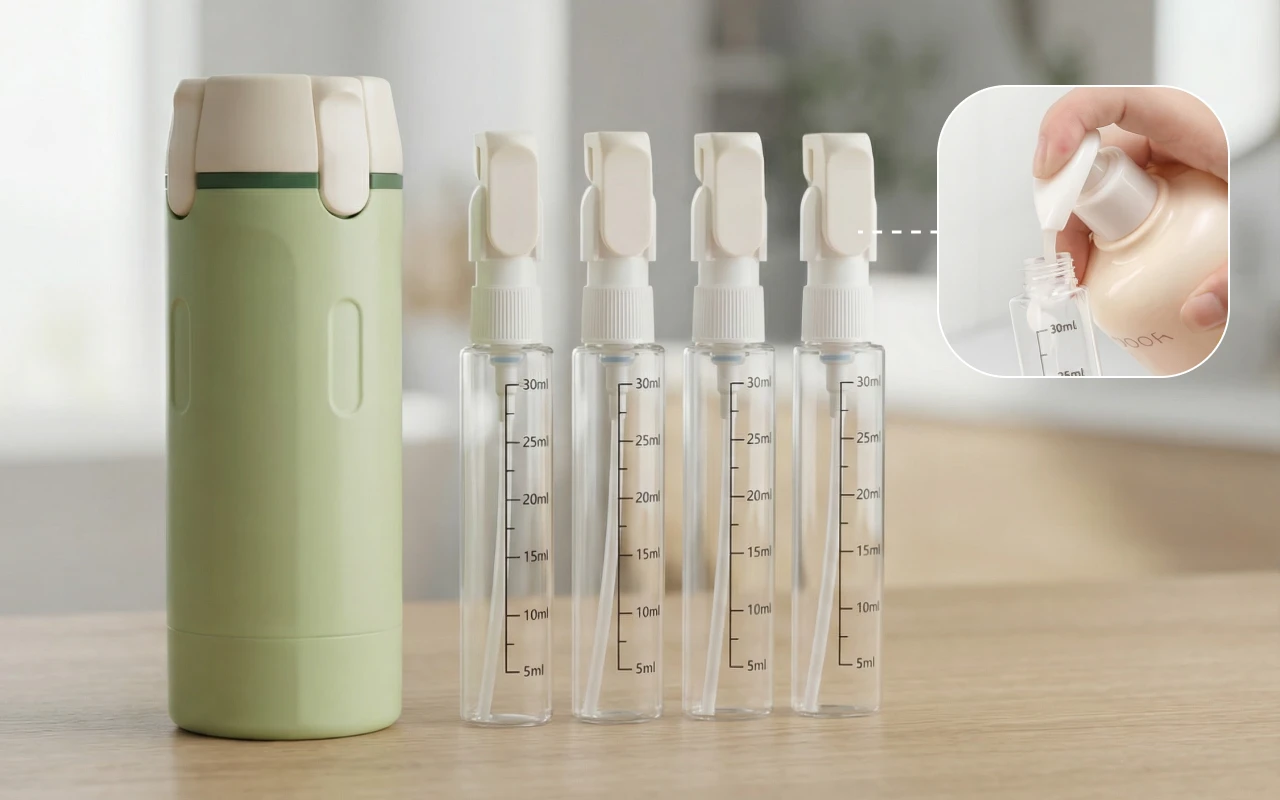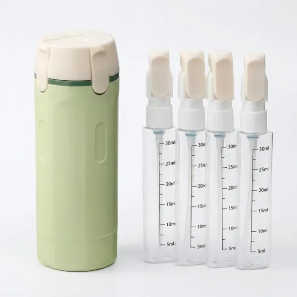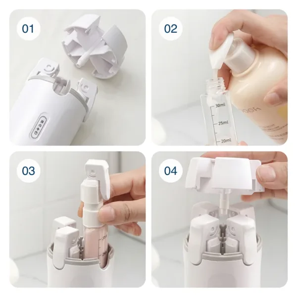 Τέσσερα δοχεία εφαρμόζουν τακτοποιημένα σε έναν μικρό διανεμητή Ortorex. Οι αποσκευές φαίνονται τακτοποιημένες και αισθάνονται ελαφρύτερες σε κάθε διακοπές.