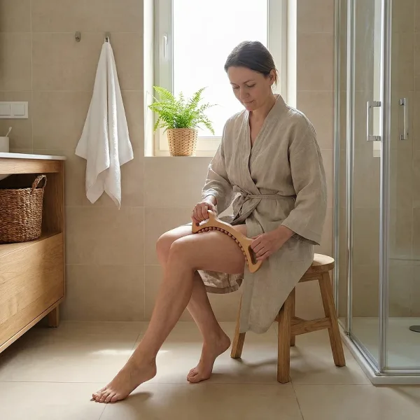 Χρησιμοποιώ το ξύλινο εργαλείο μετά το ντους με λίγο λάδι. Βοηθά τα γόνατα και τους αστραγάλους μου να χαλαρώσουν και οι μηροί μου δείχνουν λιγότερο πρησμένοι.