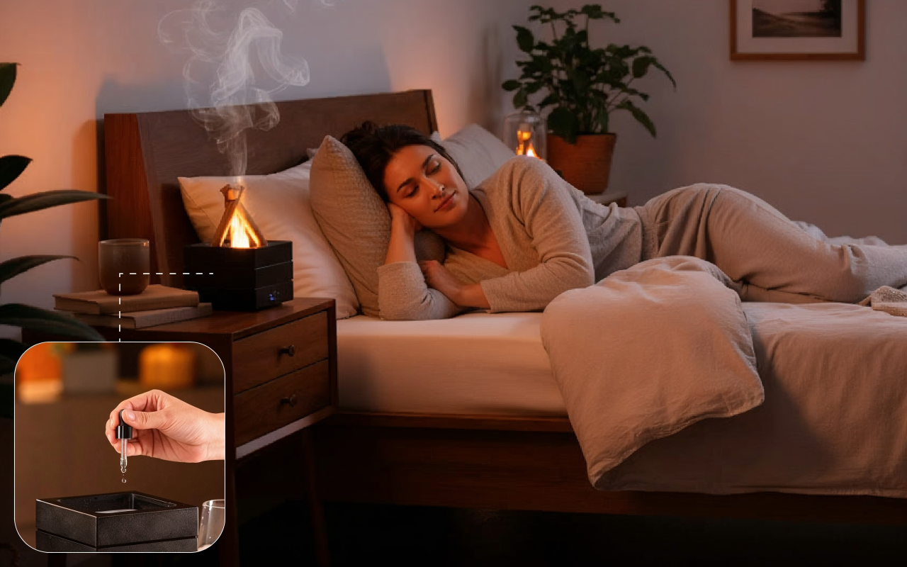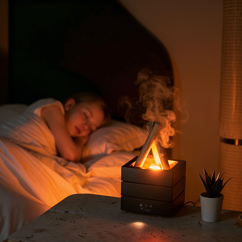Ο διαχύτης φωτιάς γεμίζει το δωμάτιό μου με ένα απαλό σύννεφο και τα εναλλασσόμενα χρώματα με βοηθούν να κοιμάμαι καλύτερα κάθεράδυ. Χρησιμοποιώ αιθέριο έλαιο λεβάντας για περισσότερη ηρεμία.