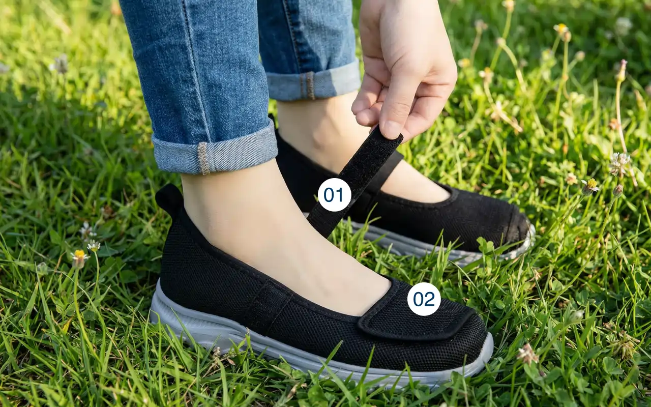 Ένα απλό κούμπωμα επιτρέπει γρήγορες αλλαγές καθώς το μέγεθος του ποδιού μεταβάλλεται μέσα στην ημέρα. Αυτό βοηθά στην αποφυγή σφιξίματος που προκαλείται από πρήξιμο ή ευαισθησία.