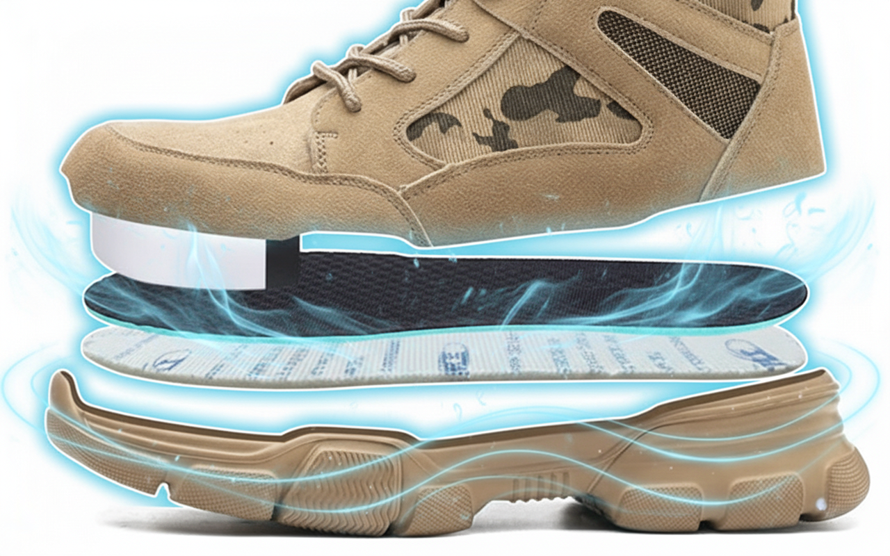 Εύκαμπτα υλικά προσαρμόζονται σε κάθε κίνηση χωρίς δυσκαμψία. Η διαπνεόμενη επένδυση μειώνει τον ιδρώτα και διατηρεί το πόδι δροσερό για ώρες.